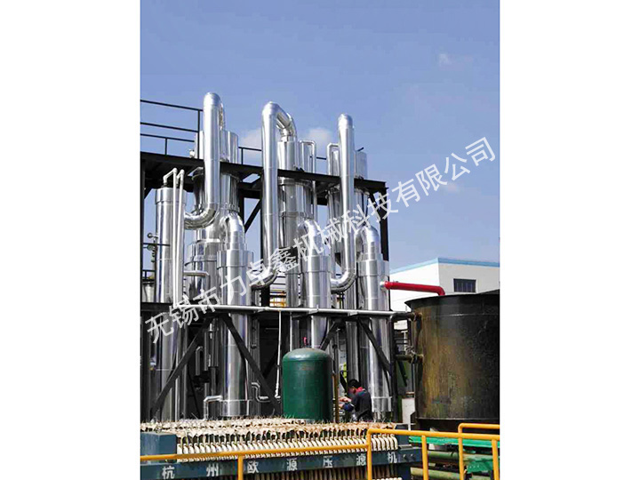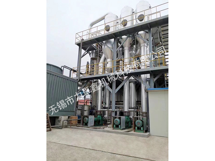工作原理:四效降膜蒸發器需濃縮的料液由泵送入加熱管頂部,沿著加熱管內壁形成液膜向下流動。在這個過程中,由于管外的加熱,管內液膜開始沸騰并部分蒸發